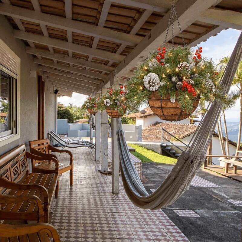 FESTIVE APPEAL: A delightful way to add instant Christmas spirit to any indoor or outdoor space. With individually crafted branch tips, this hanging Christmas plant is as charming as the real thing.