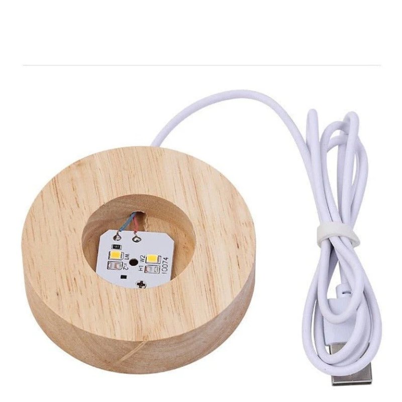 - It sits on a wooden stand with a built-in LED base, powered by a USB cable.
