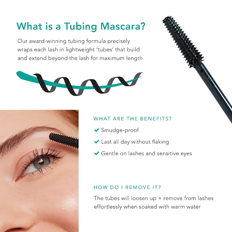 Removal: To remove, simply rinse off our mascara with warm water and a washcloth using a gentle downward-sweeping motion. Our unique tubing formula will rinse off each lash, leaving no mascara streaks behind or black stains on your towels! You can also use your favorite cleanser or makeup remover.