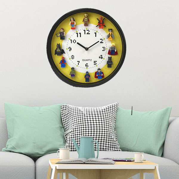 Large analog wall clock with 12 mini figures. (Superheroes)